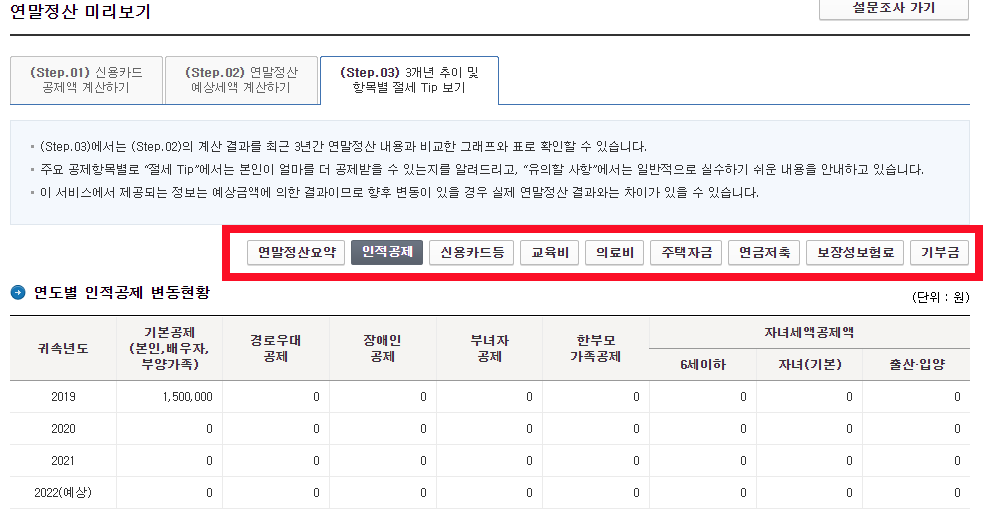 - (Step.03)에서는 (Step.02)의 계산 결과를 최근 3년간 연말정산 내용과 비교한 그래프와 표로 확인할 수 있습니다.